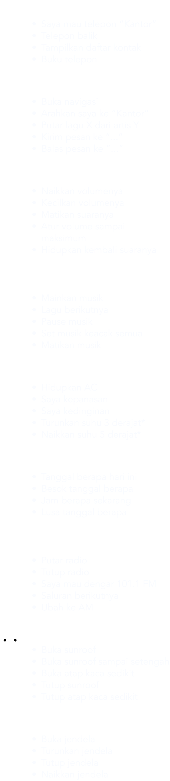Rasakan pengalaman berkendara yang lebih mudah dengan WIND (Wuling Indonesian Command). Perintah mobil Anda dengan menggunakan suara untuk mengoperasikan beberapa fitur berikut!